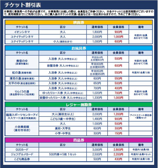 各種サービスについては、直接各施設で会員証を提示することで割引を受けられるもの、事務局で割引チケットを購入できるものなどに分かれます。